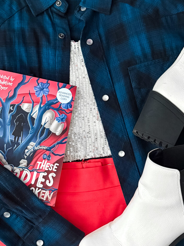 For my look, I wanted to capture the tension and resilience at the heart of These Bodies Ain’t Broken. The bold red pencil skirt isn’t just eye-catching; it’s a nod to both blood and defiance, a refusal to fade into the background when survival demands you stand out. The sparkly cropped top glimmers like danger just out of sight, echoing the monstrous transformations and cursed magic threaded through these stories. I layered on a blue plaid shirt straight from the Supernatural set, a wink to the eerie battles fought in dark woods and cursed towns. And finally, the white boots with their practical heel ground the outfit in grit and determination, the kind you’d need to outsmart a deadly video game, confront an ancient evil, or fight alongside a vampire friend who’s just as dangerous as they are loyal.